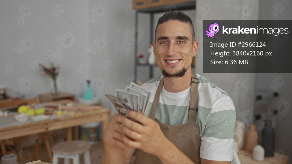 Man in apron counting dollar bills with hands in pottery studio, surrounded by clay vessels, tools and workbench, smiling at camera; pride success.
