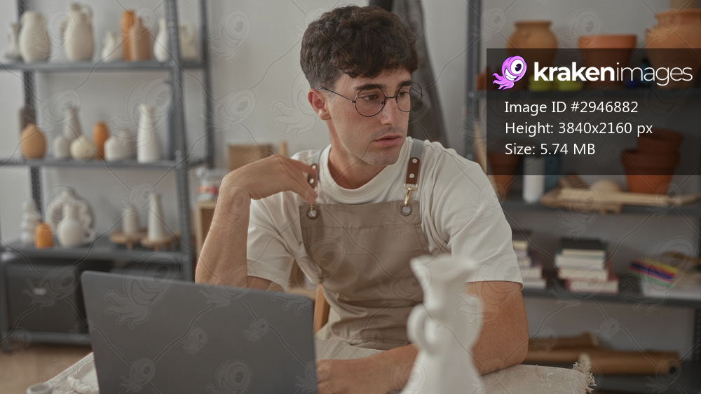 Man in apron and glasses typing on laptop at studio table with ceramic vases while hand adjusts strap on chest; focused creativity.
