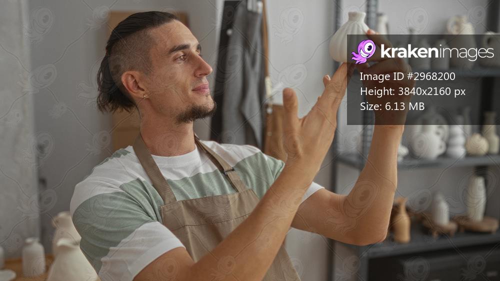 Man in apron holding a small white ceramic vase with both hands and inspecting its form in a studio; concentration craft.