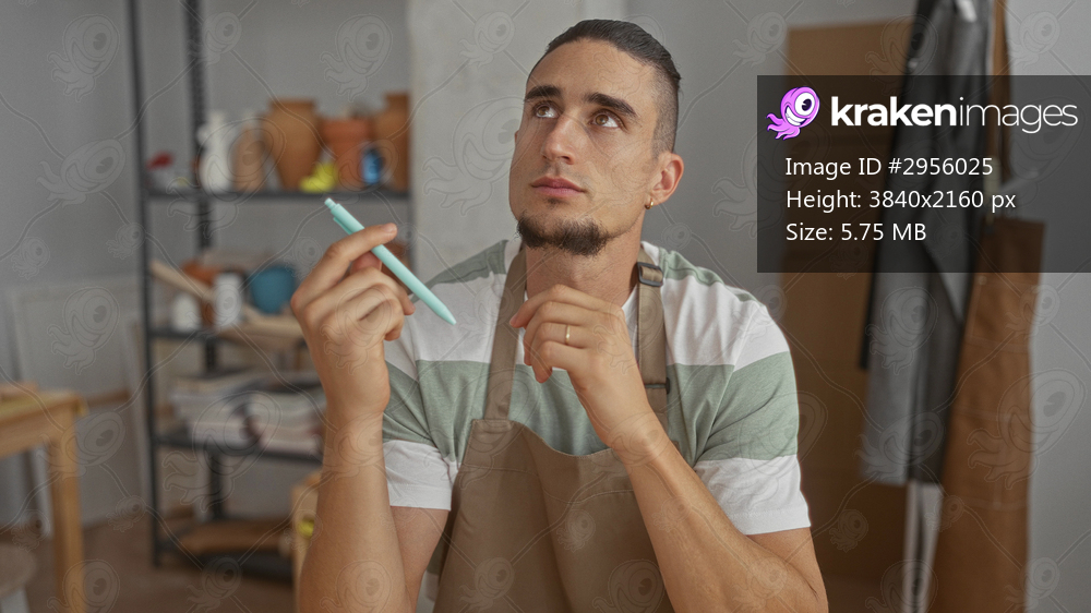 Man in apron holding pen to chin and looking up among pottery shelves and clay pots at a studio workbench; thoughtful creative focus.