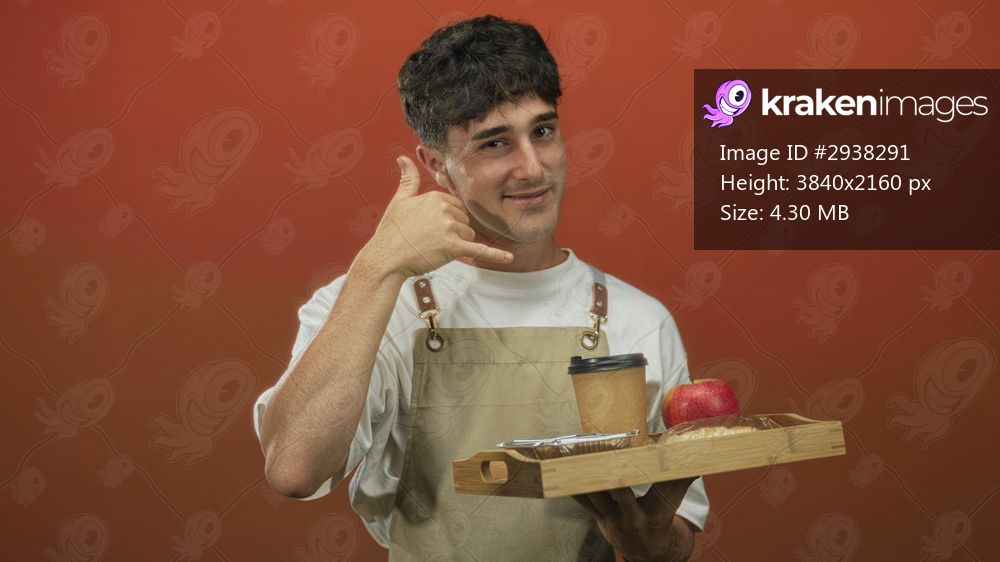 Man in apron holds breakfast tray with coffee cup and apple while making call me hand sign in orange studio; friendly service.