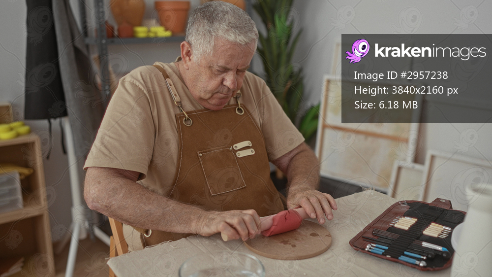 Man in apron presses and rolls clay with hands and rolling pin beside pottery tools on table in studio; focus patience craftsmanship.