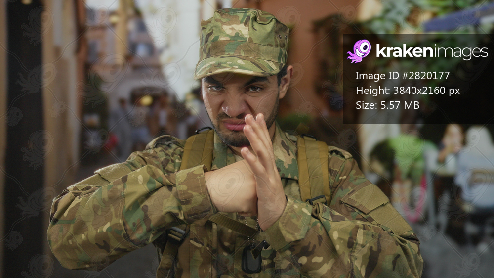 Man in army uniform clenching fist and blocking with palm on old town street lined with stone buildings; anger.