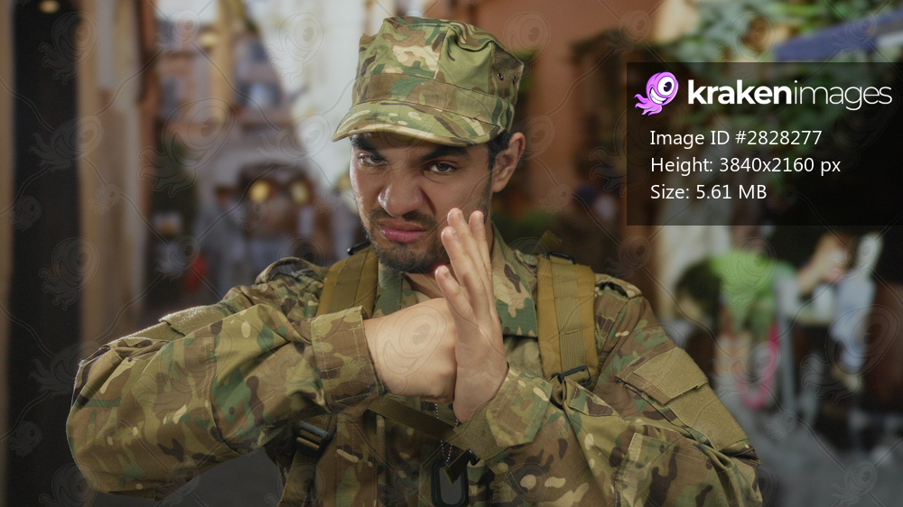 Man in army uniform clenching fist and blocking with palm on old town street lined with stone buildings; anger.