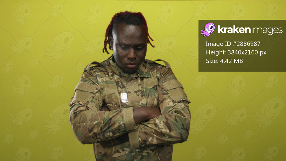 Man in army uniform wearing dog tags and crossed arms in studio against lime green backdrop; pride duty.