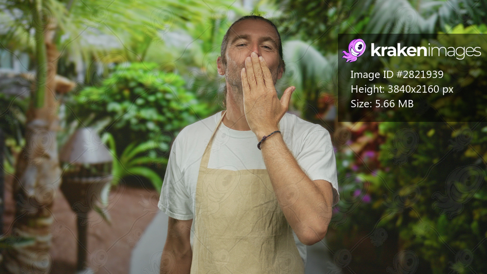 Man in beige apron blows a kiss with outstretched hand in green park setting; affection warmth connection joy.