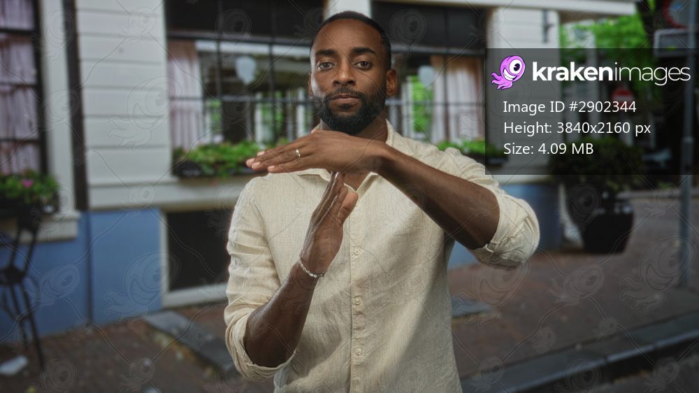 Man in beige linen shirt with bracelet and ring, hands making timeout gesture on a city street in front of a storefront building; calm focus.
