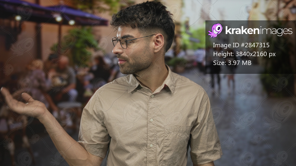 Man in beige shirt and glasses extends his hand with a warm smile on street terrace under sunlight; casual greeting.