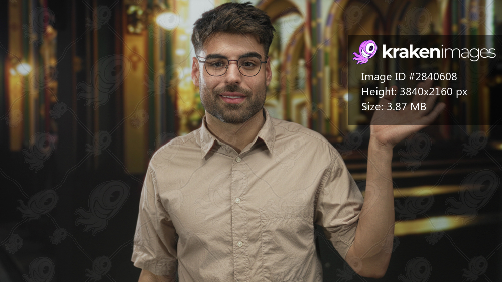 Man in beige shirt and round glasses smiling and waving hand in church building; serenity faith.