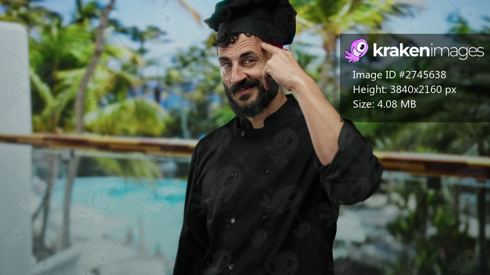 Man in black chef uniform standing outdoors with palm trees and hotel in background, showcasing thoughtful expression by pointing finger at head, hinting culinary creativity. - Kraken Images