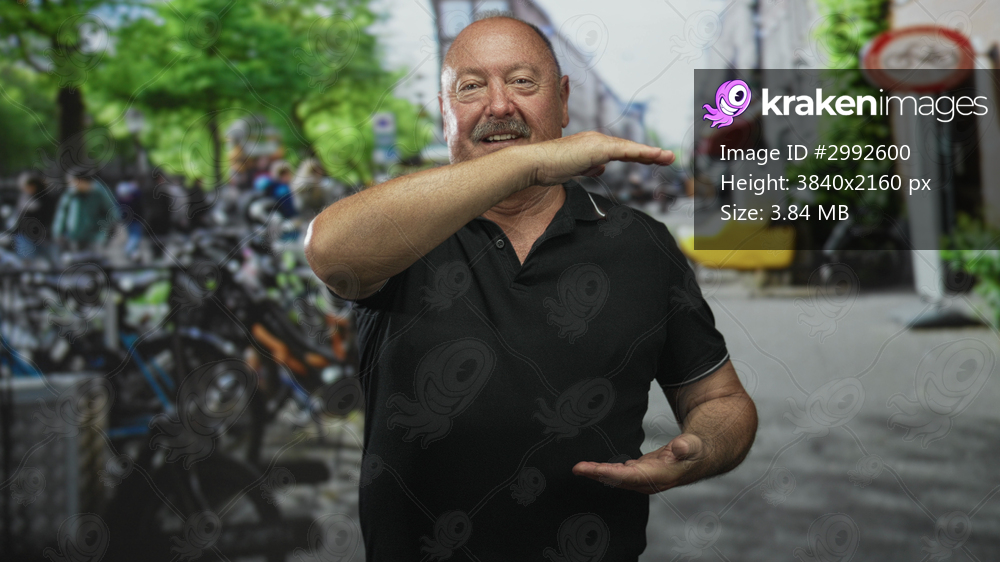 Man in black polo shirt smiling with arms out on a busy street lined with bicycles and sidewalk cafes; friendliness maturity.
