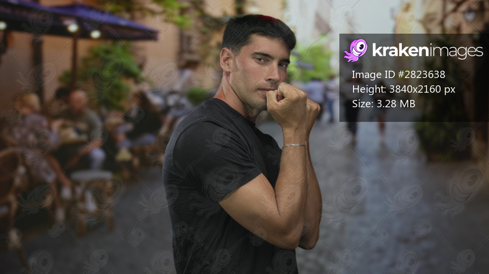 Man in black shirt with clenched fists raised in a cobblestone street; determination resilience strength.