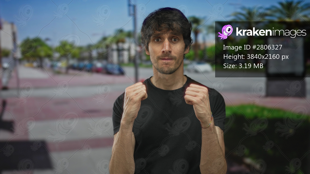Man in black shirt clenches fists near chest on sunny city street lined with palm trees; anticipation hope.