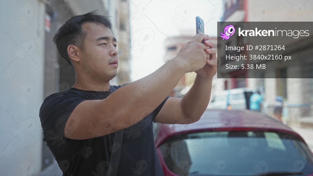 Man in black shirt holds smartphone and taps screen on sunny street; digital connectivity and concentration.