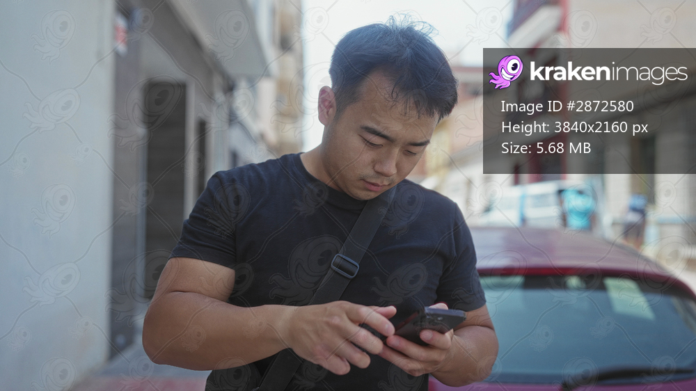 Man in black shirt holds smartphone and taps screen on sunny street; digital connectivity and concentration.