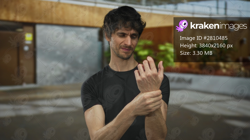 Man in black shirt holds wrist and frowns in front of building under sunlight; injury discomfort recovery.