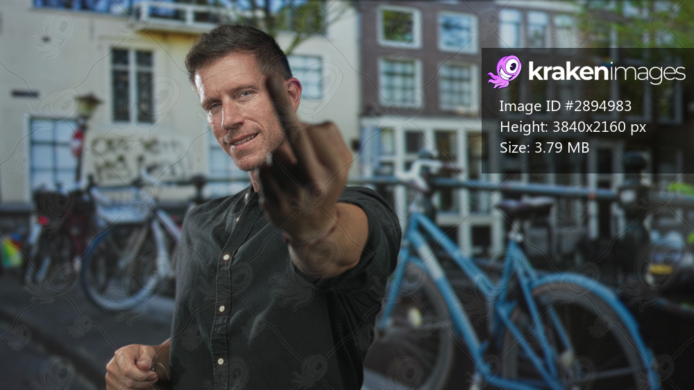 Man in black shirt shows middle finger toward camera on a busy street by parked bicycle and canal in amsterdam; defiance rebellion.