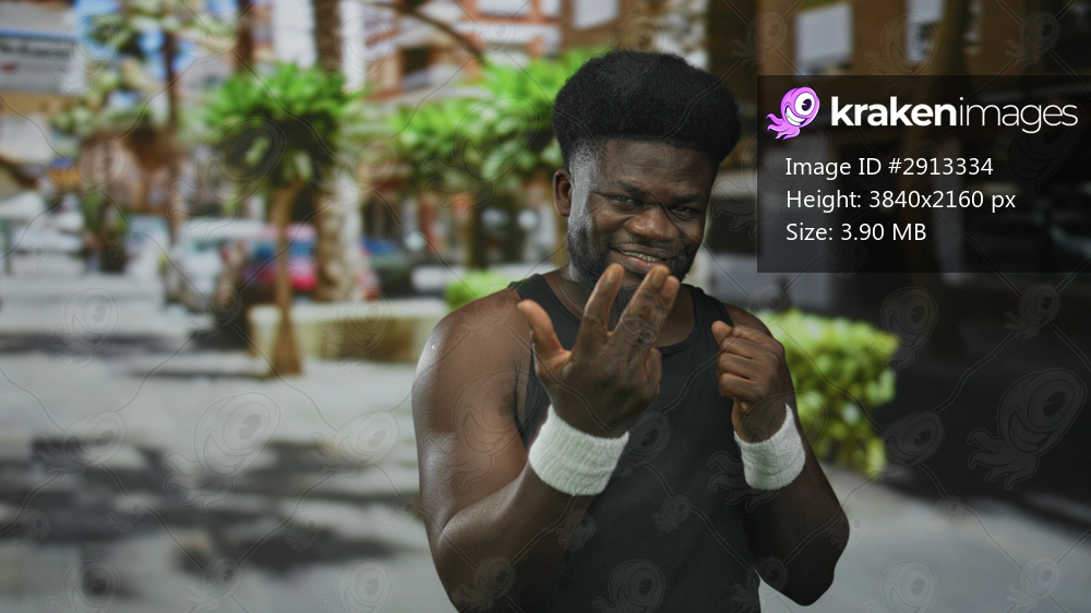 Man in black tank top with white wristbands holding fists up with bare arms visible in a sunny street plaza, smiling broadly and grinning; confidence training fitness strength. - Kraken Images