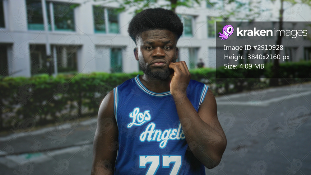 Man in blue basketball jersey with hand to cheek for toothache on city street near hedge; discomfort.
