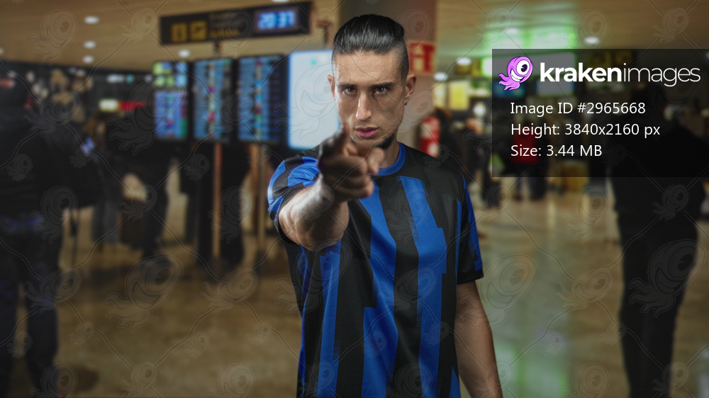 Man in blue and black soccer jersey beckons with hand at busy airport check in area with flight information boards visible; challenge.