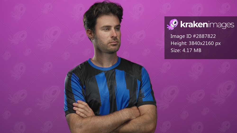 Man in blue and black soccer jersey with crossed arms showing forearms in studio against purple wall; confidence support.