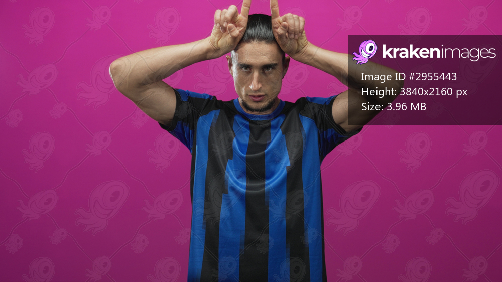 Man in blue and black soccer jersey holds index fingers to head like horns in studio, hands visible and direct stare; playful taunt.