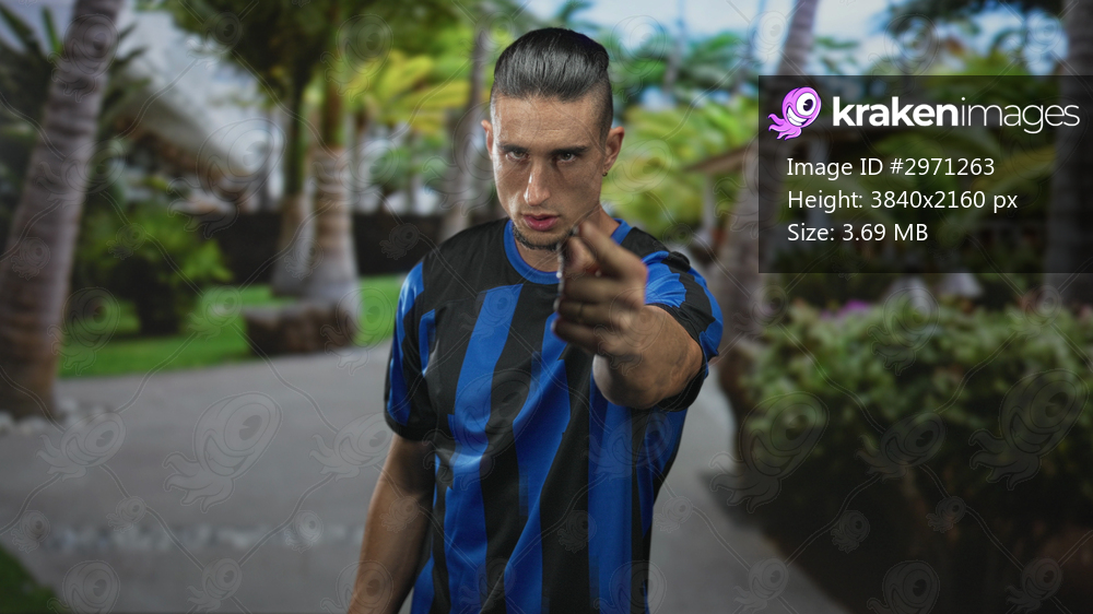 Man in blue and black soccer jersey pointing a forefinger at camera on a palm lined resort path; defiance challenge.