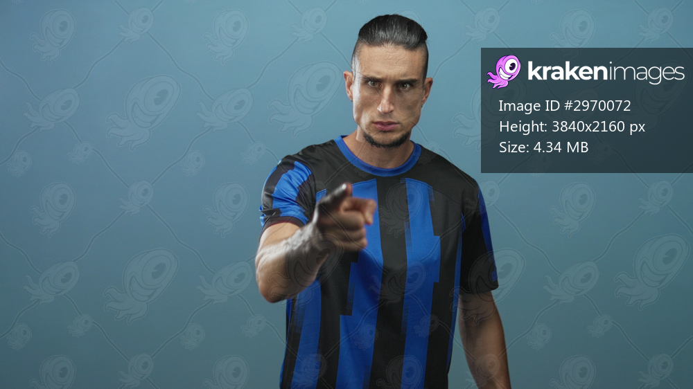 Man in blue and black soccer jersey pointing finger toward camera with stern gaze in studio; determination challenge drive.