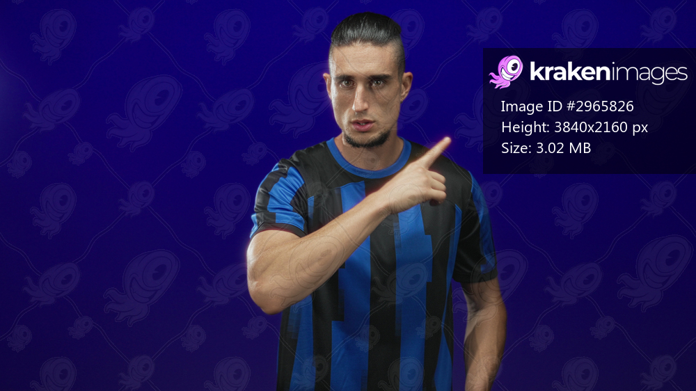 Man in blue and black soccer jersey points finger at camera with stern gaze and assertive pose against a plain studio backdrop; determination challenge focus. - Kraken Images