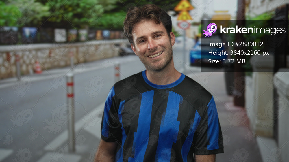 Man in blue and black soccer jersey smiling and tilting head on a city street near a parked car, stone wall and bollards; pride team support.