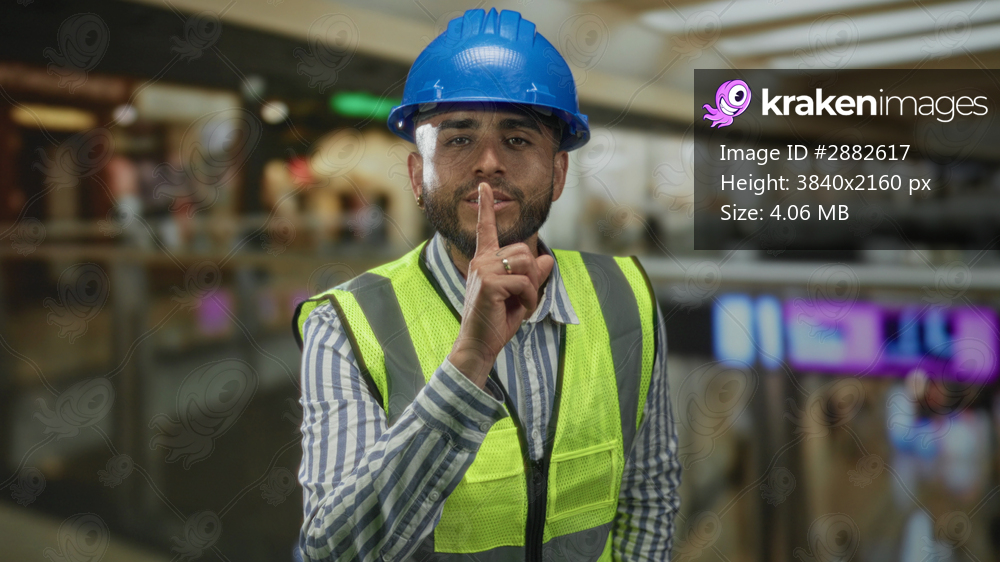 Man in blue hardhat and neon high visibility vest with finger to chin gesture in busy shopping mall building; confidence.