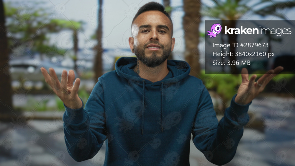 Man in blue hoodie with beard and visible hands gesturing in park near palm trees and sidewalk; frustration questioning.