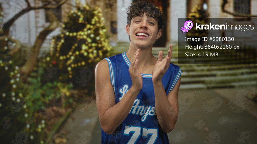 Man in blue los angeles basketball jersey clapping hands and smiling on steps of a building decorated with lights and trees; youthful joy.