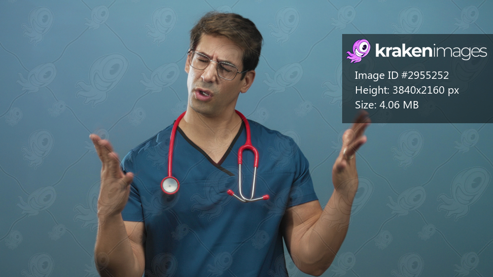 Man in blue scrubs with stethoscope gesturing hands in studio, wearing glasses and ring, forearms visible and expressive; clinical concern.