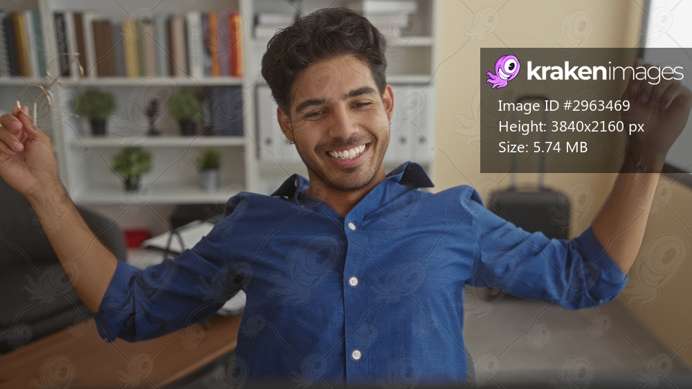 Man in blue shirt adjusts glasses and smiles at a computer monitor, stretching arms beside a bookshelf and suitcase in an office building; relaxed focus. - Kraken Images