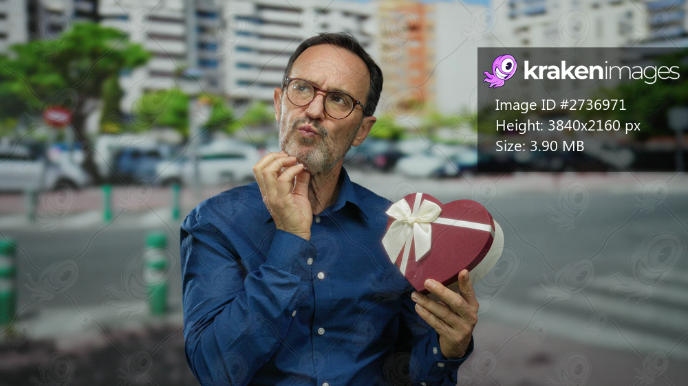 Man in blue shirt holding heart gift box in city street with thoughtful expression against urban background depicting a mature romantic moment.