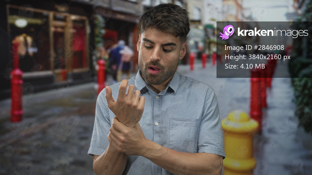 Man in blue shirt holds wrist on city street with red bollards and blurred storefronts; pain discomfort.