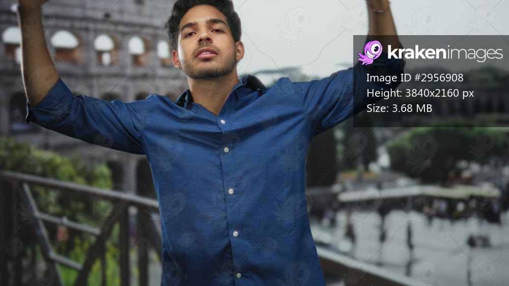 Man in blue shirt pointing hand toward camera by railing at building colosseum; invitation travel memory.