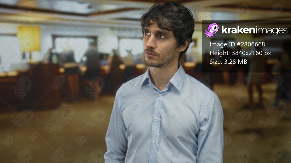 Man in blue shirt raises open palm for attention in hotel building; calm respect courtesy professionalism.