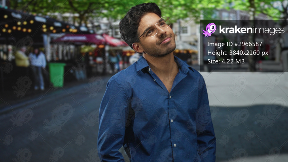 Man in blue shirt wearing glasses tilts his head, smiles and looks up amid cafe lights and trees on a street lined with buildings; optimism curiosity.
