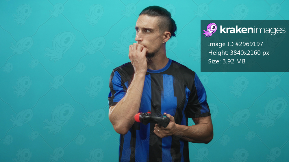 Man in blue soccer jersey holding a gamepad with fingers to mouth and looking sideways in studio; contemplation focus.