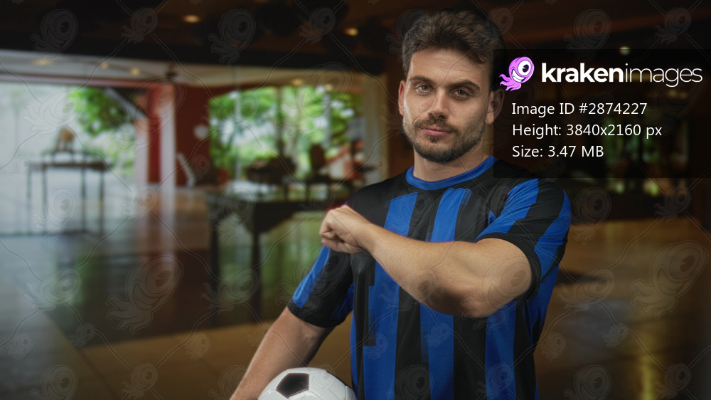 Man in blue soccer jersey holding soccer ball points fist toward camera in hotel building; confidence challenge.