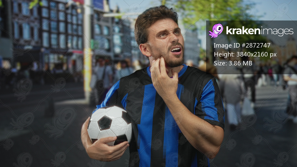 Man in blue striped jersey holding a soccer ball, hand on cheek for toothache on a busy city street; pain recovery.
