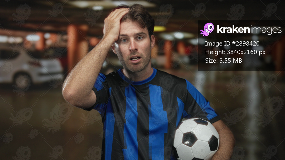 Man in blue striped soccer jersey holding a black and white ball, hand on forehead in parking building with blurred cars and concrete pillars; solo frustration. - Kraken Images