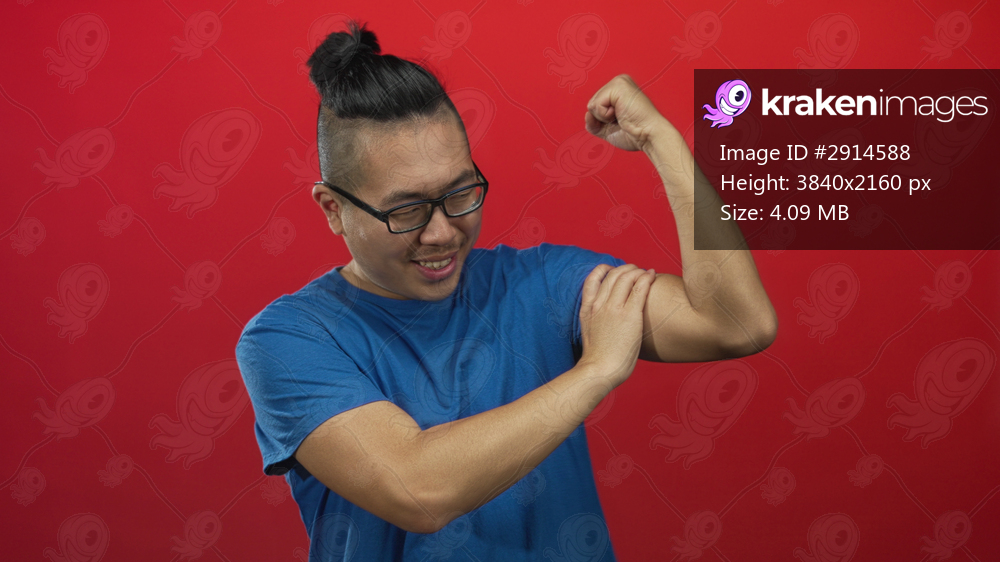 Man in blue t shirt and glasses flexes biceps and smiles while posing against a solid red studio wall; confidence.