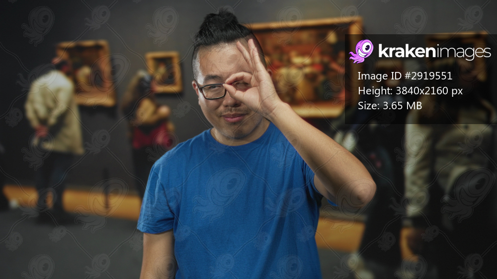 Man in blue t shirt and glasses makes ok sign over right eye while standing before framed paintings in museum building; playful curiosity.