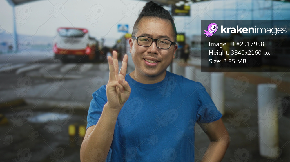 Man in blue t shirt wearing glasses and ponytail points finger to terminal at airport while smiling and hand on hip; curiosity travel.