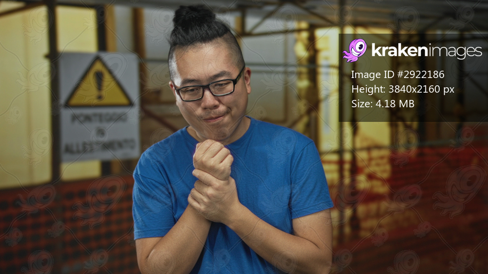 Man in blue tshirt wearing glasses with hands clasped and palms up shrugging in building under scaffolding; uncertainty.