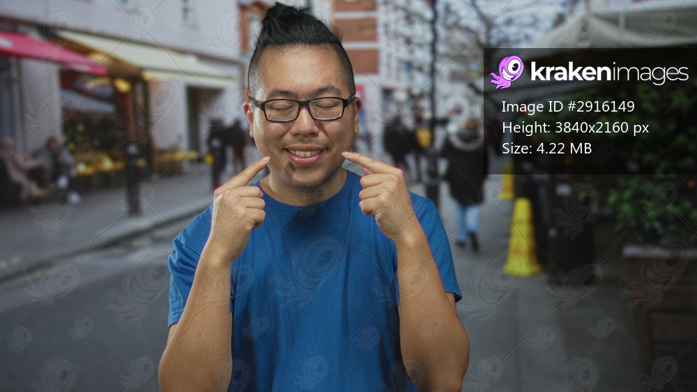 Man in blue tshirt wearing glasses touching lips and pointing fingers to cheeks on street; playful confidence.