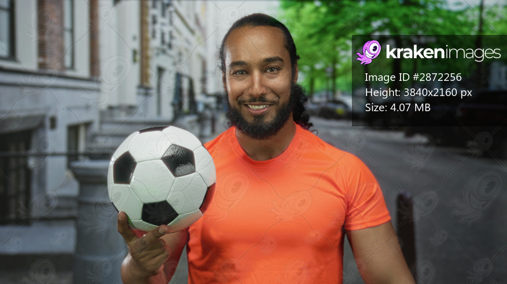 Man in bright orange shirt holds a soccer ball with his fingertips while smiling and balancing on a city street with parked cars and trees; confidence skill. - Kraken Images